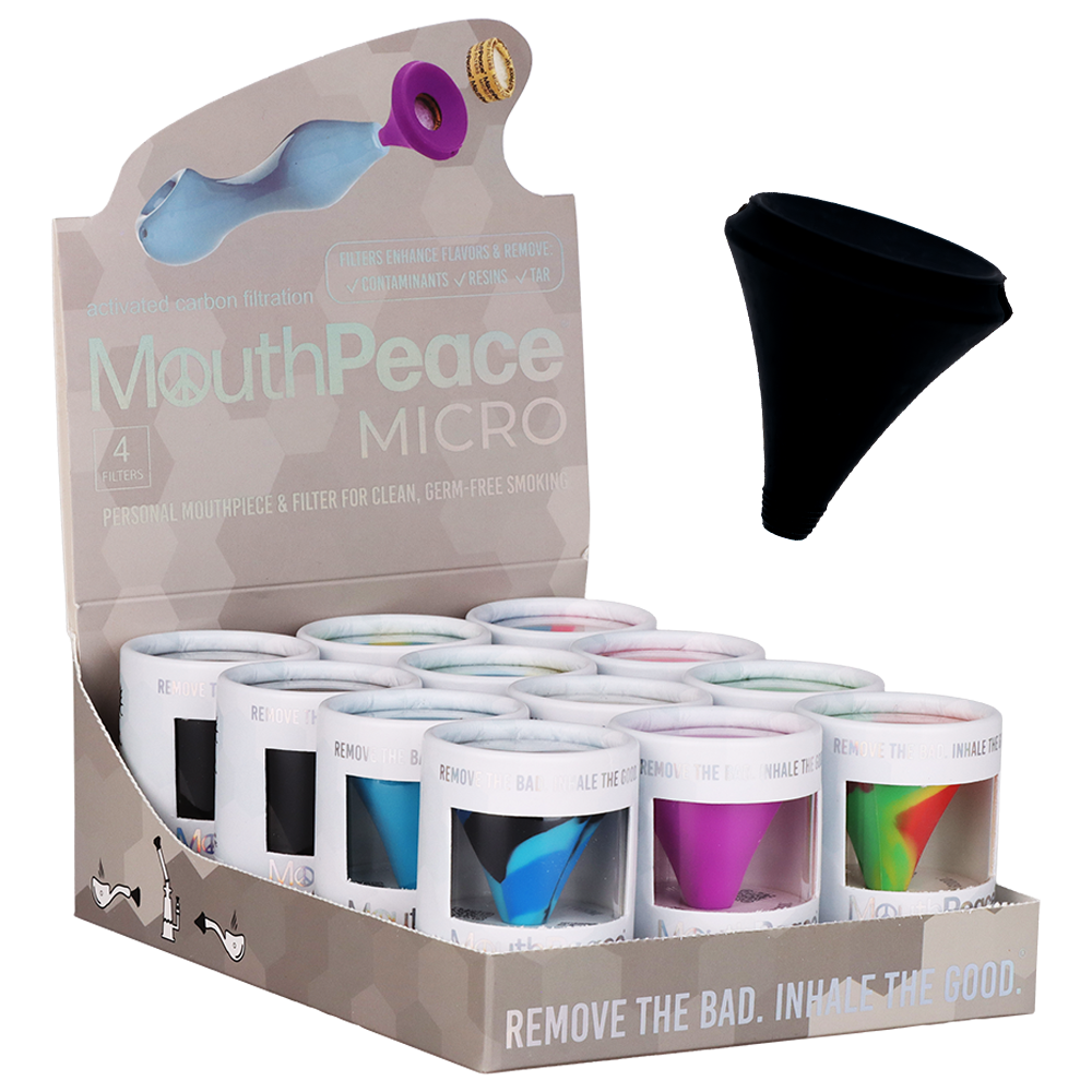 The Sleek Art Deco Mini Glass Water Pipe measures 5.5 inches (14cm) tall and is made of colorful borosilicate glass. The fixed interior downstem is perforated for water filtration and the body has an elegant shape with a geometric ripple texture on the exterior. Includes a 10mm male bubble style herb slide with marble grips. Colors vary.